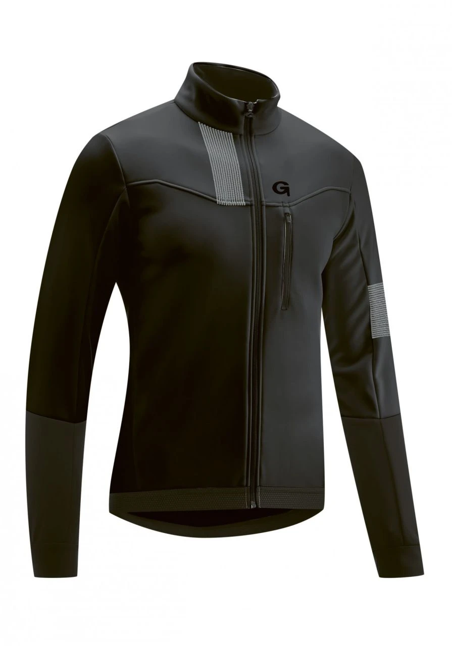 Winddicht, wasserabweisend und ein hohes Wärmeisolationsvermögen zeichnen die neue Softshelljacke aus. Für gute Sichtbarkeit hat die Valaff von GONSO für Herren modische Elemente mit Reflektion.